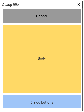 The layout of a dialog is composed of three main areas: a header, a body and a buttons area.