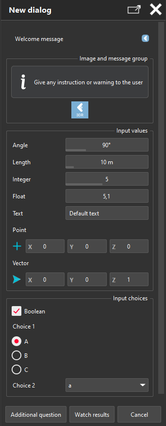 | 3D vector coordinates | SDialog.AddVector |